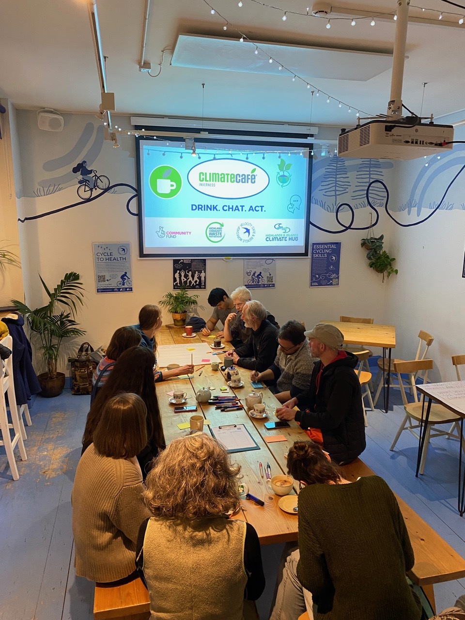 Established in 2023, Climate Café® Inverness was coordinated by Isabel from the social enterprise Velocity Café & Bicycle Workshop and by Rachel from the Highlands and Islands Climate Hub.
